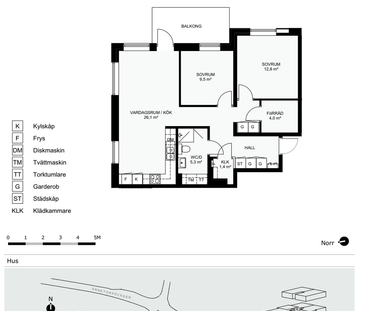 Modern tvåa med balkong mot grönskande innergård i Elineg...