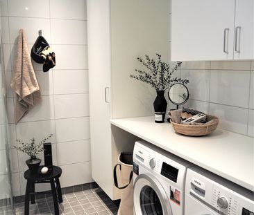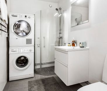 En enkel lägenhet med stort badrum med både tvättmaskin o...