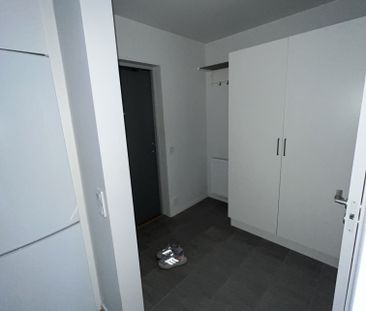 Välkommen hem till Hyllie. Hall med grått klinkergolv och...