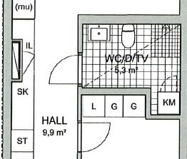 Bostaden har genomgående ekparkett förutom vid ytterdörre...