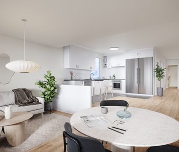 Denna välplanerade lägenhet har ett kök med vita skåpsluc...