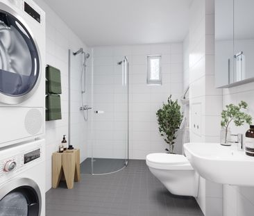 Lägenheten helkaklat badrum med vitt kakel och grått klin...