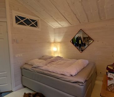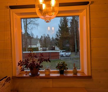 Fin stuga med skogen bakom knuten.1 km till busshållplats...