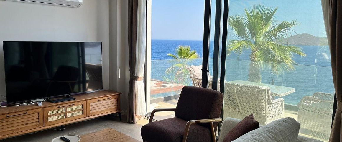 Geris Mahallesi, Bodrum, Mugla, Moblerad lägenhet med havsutsikt i ett komplex i Bodrum Geris